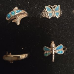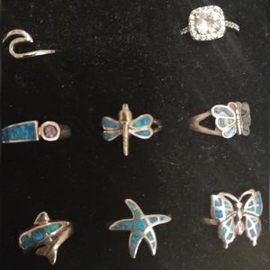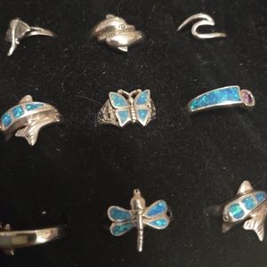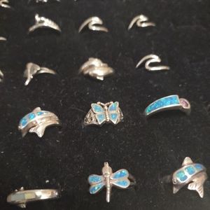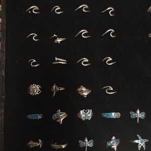 Italian silver rings, prices vary they mainly are all around $45 besides the wave rings they are $15 each. Can size them whichever size you need. The ones that have blue are Topaz gems.