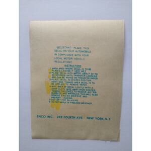 Original new old stock circa 1950's decal. Made by Enco. Size on decal is 4.5" x 3.5". Has some light age wear to edges and back.