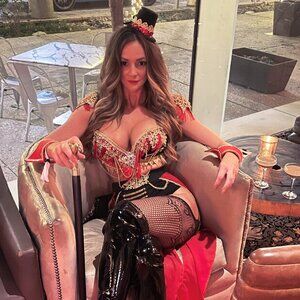Description: Gold lace trim, rhinestones, gold buttons, red fringe trim, draping gold chains.