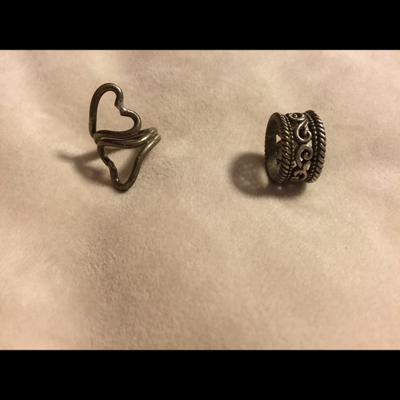 925 silver rings. They are tarnished but that is taken care of with a bit of silver polish. 15 dollars each or 25 for both.