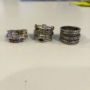 3 silver- colored rings; 2 with colored crystals & 1 with clear- colored crystals.