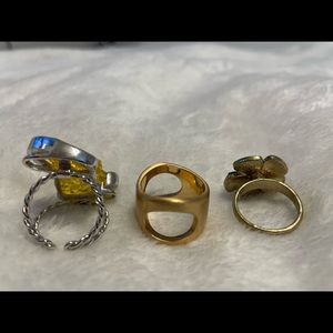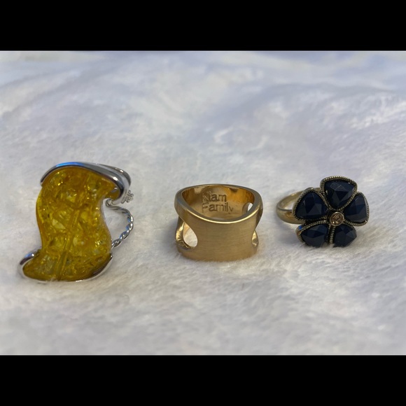 3 rings in total. I wear a size 8 ring finger, and I believe these to be that fit. The gold ring says Kiam Family on the inside. The other two rings have no markings. The ring with the yellow crystal stone can be adjustable. The flower is a dark blue sapphire color.