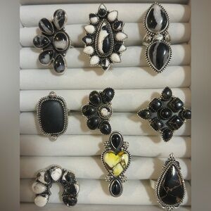 Turquoise rings most are adjustable except the one with the yellow heart and black onyx is an 8 and the double zebra jasper is a 6 please message if interested in one