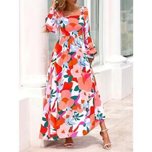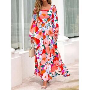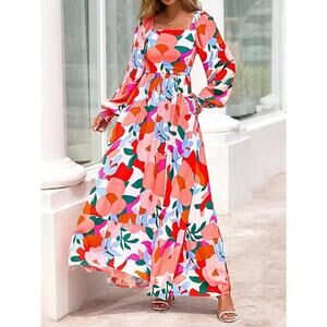 Rio Bright Floral Smocked Maximalist Boho Cottage Prairie Modest Maxi Dress LG