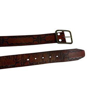 Rio Grande Womens Western Tooled Belt Size 38 Cognac Brown Steerhide Leather Full Grain Vintage Coastal Cowgirl Distressed Rugged Medieval Brass Buckle Stamped with an R for Rio Made in USA
