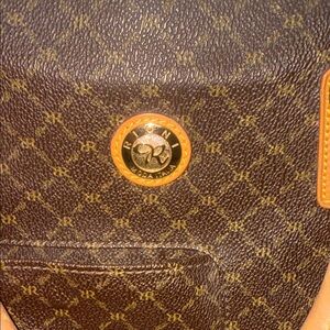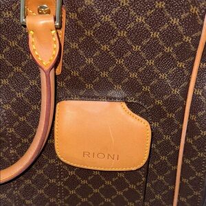 Elegant Rioni tote with a classic brown pattern. Tan leather trim enhances style. Ideal for everyday use.