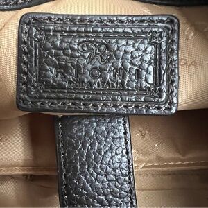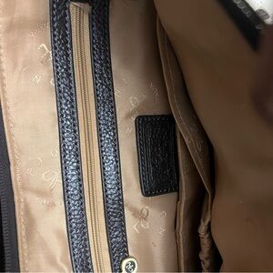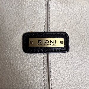 A great bag to have all year round. A cream-colored leather body embossed with the RIONI Moda Italia emblem. Accented with dark chocolate-colored leather trimmings. Double handle straps made of leather and sturdy brass chains. Front and rear zippered pocket. Top zip closure opens to interior goldenrod fabric RIONI monogram print lining, cell phone pouch, pocket pouch, zippered pocket. Interior side compartment fits most tablets.