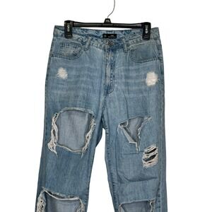 Riot Misguided Jeans High-Rise Mom Ripped Knee Ankle Destroyed Denim Blue Medium