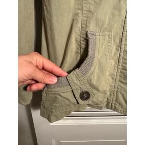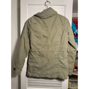 Super cute jacket with hideable hood. Cute buttons. Super functional. No flaws.
