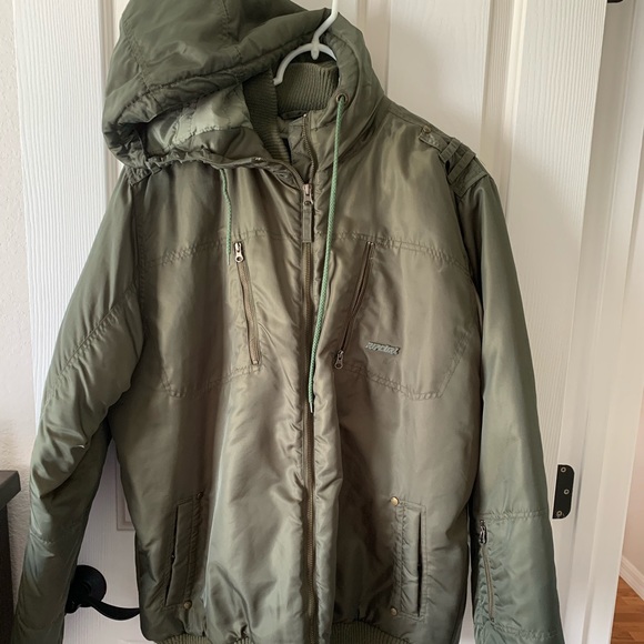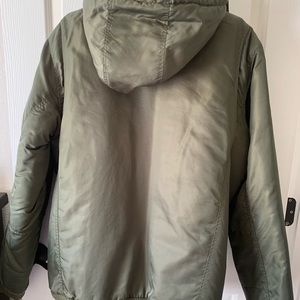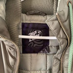 Rip Curl Bomber Hooded Jacket in Military green. Super warm jacket with quilted interior & padding and brass hardware.