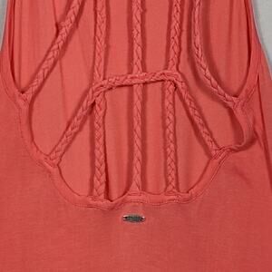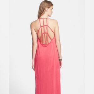 Rip Curl Go Wild knit maxi dress. Low scoop back with braided strap details. Side skirt slit. Bright coral color. All measurements are approximate and are taken lying flat and unstretched