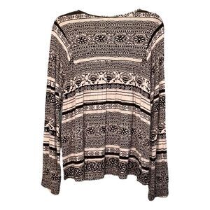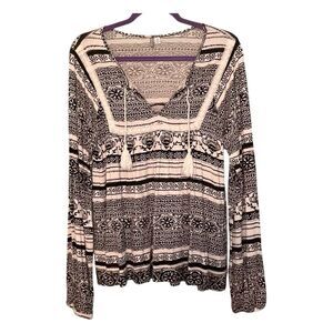 Rip Curl Black and White Floral and Striped Mixed Print Bohemian Top. It features a V-Neck with Tassels, Elastic Cuffed Long Sleeves, Lace Accents and it is a Pull-Over style.