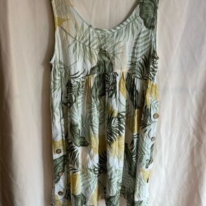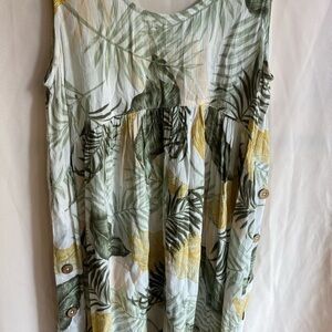 Sleeveless dress with leaf design. Features green and yellow tones.