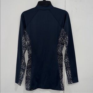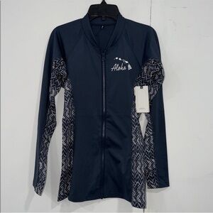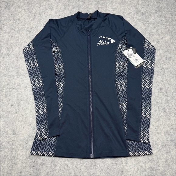 Rip Curl long-sleeve zip-up rash guard in deep navy. Small Rip Curl logo on the chest. Designed for sun protection and active wear. Simple, sporty look.