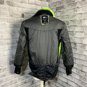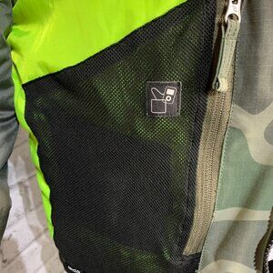 This Rip Curl snowboard ski winter jacket in size Large is perfect for both men and women who enjoy winter sports like skiing and snowboarding. The green camouflage design with a stand-up collar, hood and full zip closure adds a stylish touch to this functional and practical jacket. Made from 100% polyester with polyester insulation, it is lightweight, waterproof, and breathable, making it suitable for all seasons. The jacket also features inner and adjustable pockets, a hood, and easy care instructions, making it a convenient and versatile option for outdoor activities in cold weather.