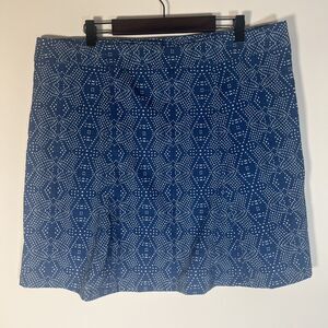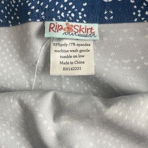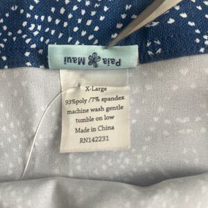 This is a Rip Skirt women's wrap skirt in size XL, featuring a tropical floral pattern in blue. Made of polyester and spandex knit fabric, this knee-length skirt has a high rise and a hook & loop closure. It is suitable for travel, parties, or casual wear, with a beach, Hawaiian, or tropical theme. The skirt is lightweight, stretchy, and machine washable, perfect for summer, fall, or spring occasions.