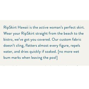 Beautiful RipSkirt. Easy on and easy off with the velcro closure. Handy little inside pocket to stash items. Bum flattering kick pleat. Repels water. Beach to dinner perfect!