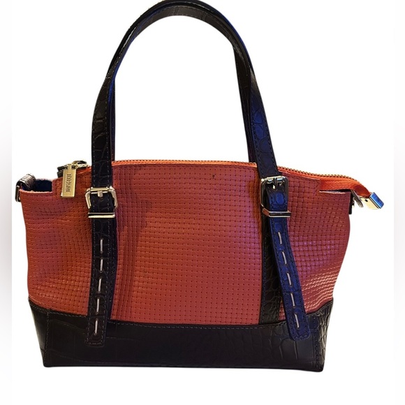 Ripani Brown Croc-Embossed Satchel Shoulder Bag is crafted in Italy from genuine leather with a rich croc-embossed finish and spotless blue lining. The medium-sized bag features a secure zip closure, gold-tone hardware, and brown leather handles with metal accents for a polished look. Perfect for both everyday use and special occasions. A timeless accessory that complements any outfit, this Ripani bag blends Italian craftsmanship with modern style. Height: 11", Width: 7", Depth: 3", Strap Drop: 13.75", Handle Drop: 21". Condition: Excellent |Color: Orange/Brown. Top-rated seller with same-day shipping—bundle and save!