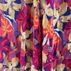 Vibrant floral loose fitting pants with a stretchy waistband. Features a mix of red, orange, and cream colors. Never worn, too short for me (5’9).