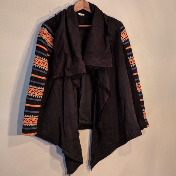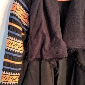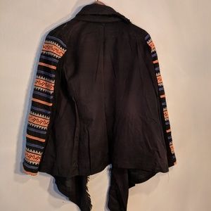 Black jacket, tribal embroidered sleeves with orange and cream. Open front, oversize shawl collar.