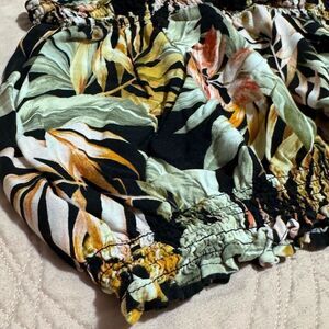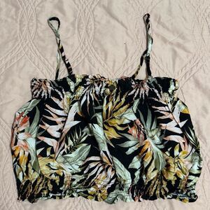 Ripcurl stretchy ruched tropical leaf print 100% viscose strappy crop top with adjustable spaghetti straps.