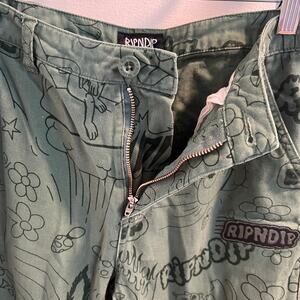 These Ripndip pants are green in color and a size 30. They have been previously owned and are in good condition, but do have some loose stitching, shown in pics.
