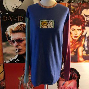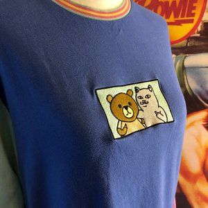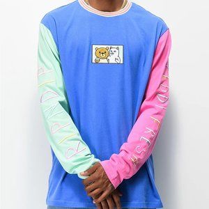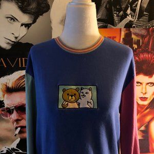 Collaboration from Ripndip and Teddy Fresh featuring everyone's favorite kitty, Nermal. The main body is blue, with an embroidered Nermal and Teddy at the center. The sleeves are pink and light green and have each brand's name embroidered on them. Ripndip clothes are unisex, but this is a men's size medium.