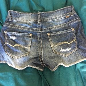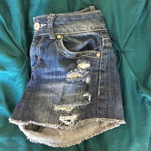 Theses shorts were my favorite but no longer fit me. Super cute slightly high waisted ripped cut off style denim shorts. The tag has faded but they are a size two.