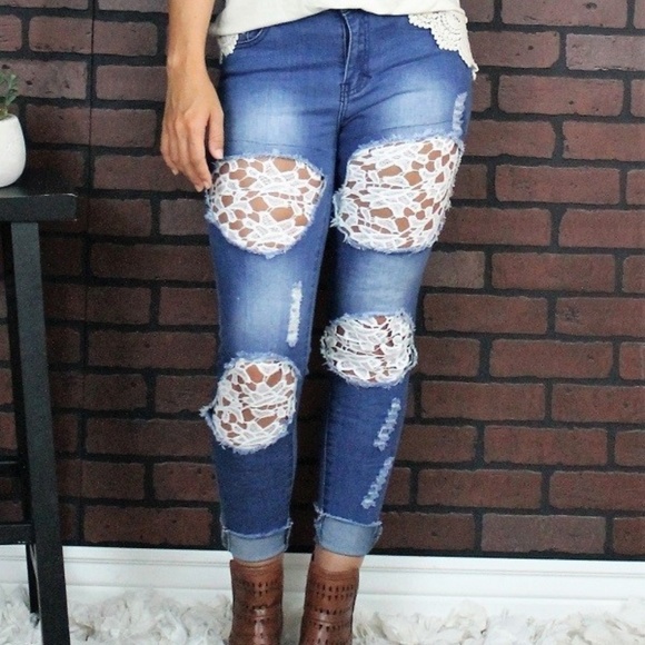 Distressed ripped denim relaxed fit Ankle skinny jeans with mid rise and cuffed hem. Crochet lace inserts fabric that HUGS you in the PERFECT places for GREAT fit and COMFORT.