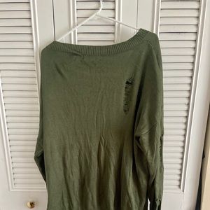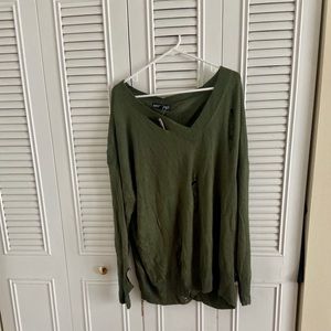 Ripped olive v neck sweater with rips located on the front and back of the sweater