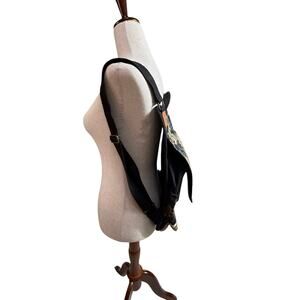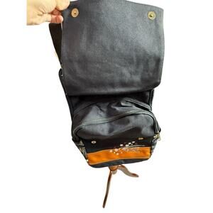 Ripple brand canvas backpack featuring an intricate Japanese-inspired dragon and cherry blossom print with embroidered details. Black canvas body with brown faux leather trim. Adjustable straps, top handle, magnetic flap closure, and zippered main compartment. Unique artistic design with a handcrafted feel.