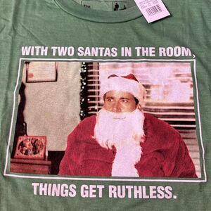 This listing is for a NWT's The Office Christmas green T-Shirt in size XL. The graphic on the front features Michael Scott dressed as Santa and says "With Two Santa's In The Room Things Get Ruthless".