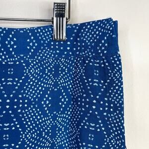 Lightweight, stretchy and quick drying blend of 93% polyester 7% spandex in the print Boho Denim, a white bohemian geometric print on a medium blue background.