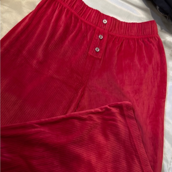 Soft ribbed lounge pants in vibrant red. Elastic waist with three-button detail. Comfortable relaxed fit for casual wear.