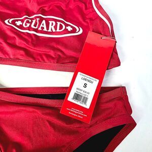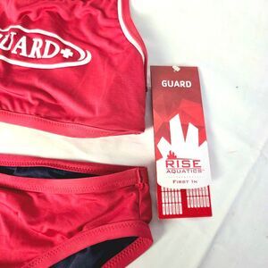 Brand new with tags Rise Aquatics lifeguard swimsuit, reversible red/navy design. Two-piece athletic style with “GUARD” logo on front. Durable polyester/spandex blend built for performance. MSRP $39.