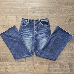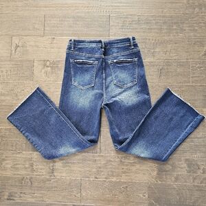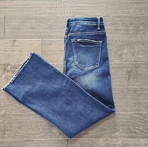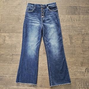 Risen Dark Wash High Rise Ankle Flare Flattering Button Fly Raw Hem Size 13/31