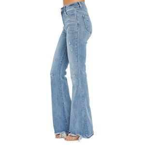 Risen High Rise Distressed Flare Jeans