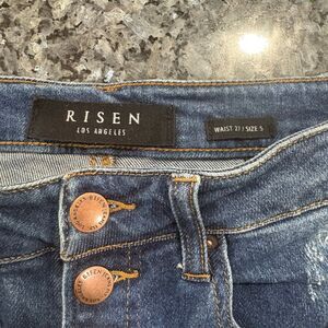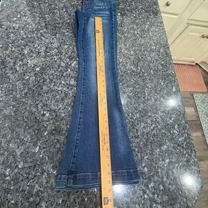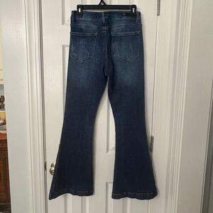 Risen brand women’s flare jeans in a dark wash.