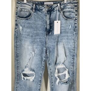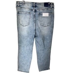 New with tags Risen high rise mom jeans in women's size 15/32. These jeans feature a heavily distressed front with frayed knee cutouts and light whiskering, while the back maintains a cleaner look with minimal distressing. Crafted in a classic light wash with a relaxed tapered leg and cropped ankle length for a modern silhouette. Made from a durable cotton-blend denim that softens with wear. Approx. 17" flat lay waist, 27" inseam. Perfect for casual outfits with sneakers, boots, or sandals. No flaws—please see photos for details.