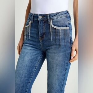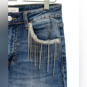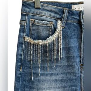 Risen Jeans High Rise Embellished Rhinestones Distressed Raw Edge