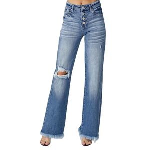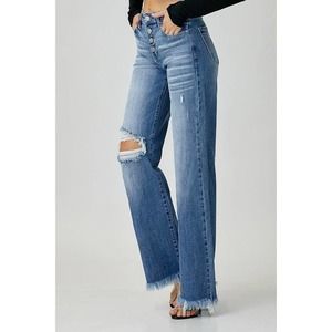Risen Mid-Rise Button Down Wide Leg Distressed Premium High Quality Stretch Denim Jeans
