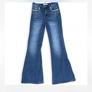 Risen jeans dolly high rise fringe jeweled silver fringe rhinestone pockets, bell bottom flare medium wash size 9/28 EUC