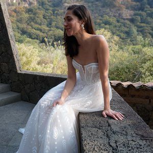 "Aspen is a gown fit for a fairytale. This dreamy yet dramatic A-line features Rish-developed botanical and geometric lace over tulle. A corset bodice with a plunging neckline adds a touch of sexiness and structure, while the voluminous skirt with blush tulle lining brings the romance. Detachable puffy long sleeves embellished in lace give the option of two looks in one and add a regal yet boho vibe."