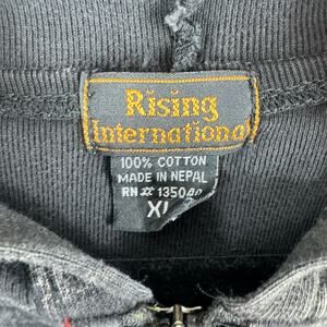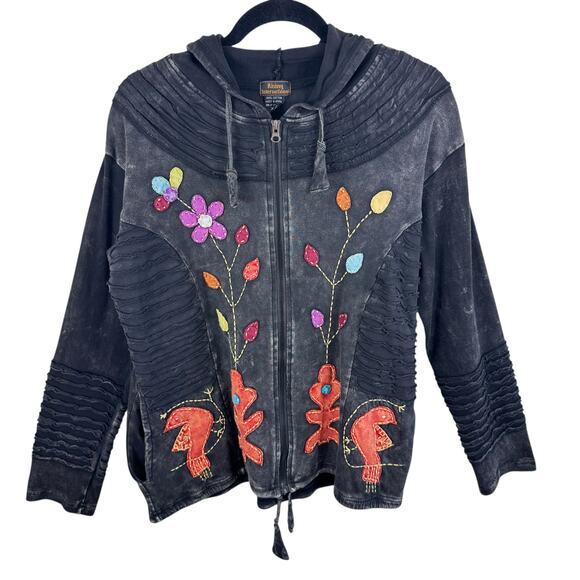 Excellent preowned condition. Rising International Black Floral Patchwork Hooded Zip Up Sweatshirt. Black has faded antiqued look to it. 100% cotton material. Approx. measurements: Shoulder to hem 25", pit to pit 23", sleeve from neck to sleeve hem 28". Size XL.