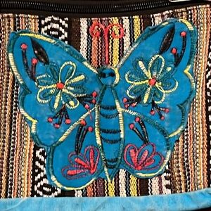 Stylish backpack with a colorful butterfly design. Made from cotton material. Features vibrant patterns, zip front and elastic side pockets for your water bottle. The backpack has adjustable straps and its large size can carry many items. Made in Nepal. Measures 14' x 15' x 4'