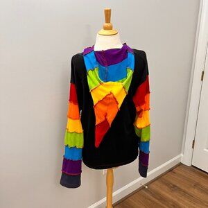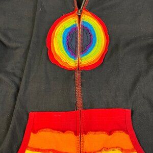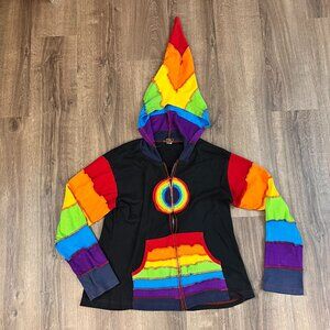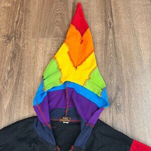 This is a crazy fun hoodie jacket. Rainbow patchwork with a textured design. I love the long pointed hood for really fun touch. 100% cotton and made in Nepal