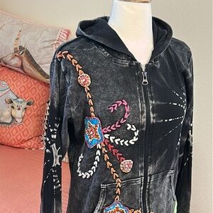 This fabulous Rising Intentional distressed look boho zip front jacket hoodie with multi-color appliques adorning the front. Made in Nepal fantastic attention to detail in excellent pre-loved condition.