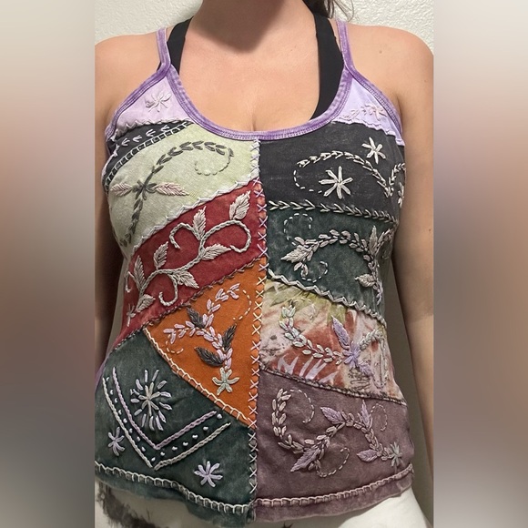 Colorful tank top with intricate embroidery. Features a patchwork design. Ideal for a bold look. Very Y2K hippie boho. Good pre loved condition- size tag is missing but is best for a medium. Modeled on a tts medium.