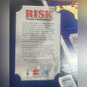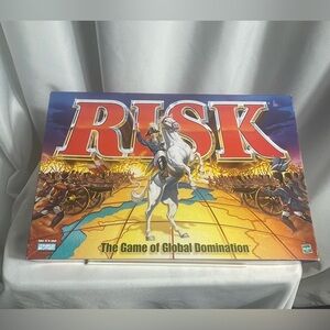 Engage in strategic battles with the classic Risk board game. Featuring vibrant red and blue colors, this game promises hours of fun and global domination. Perfect for game nights with friends and family.