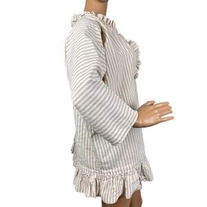 Rita NoTiara Linen Ruffle Blouse, Tan White Stripe, One Size. Features a relaxed fit, ruffled accents. Perfect for layering with a unique lagenlook style, this brand is the UK version of Magnolia Pearl.